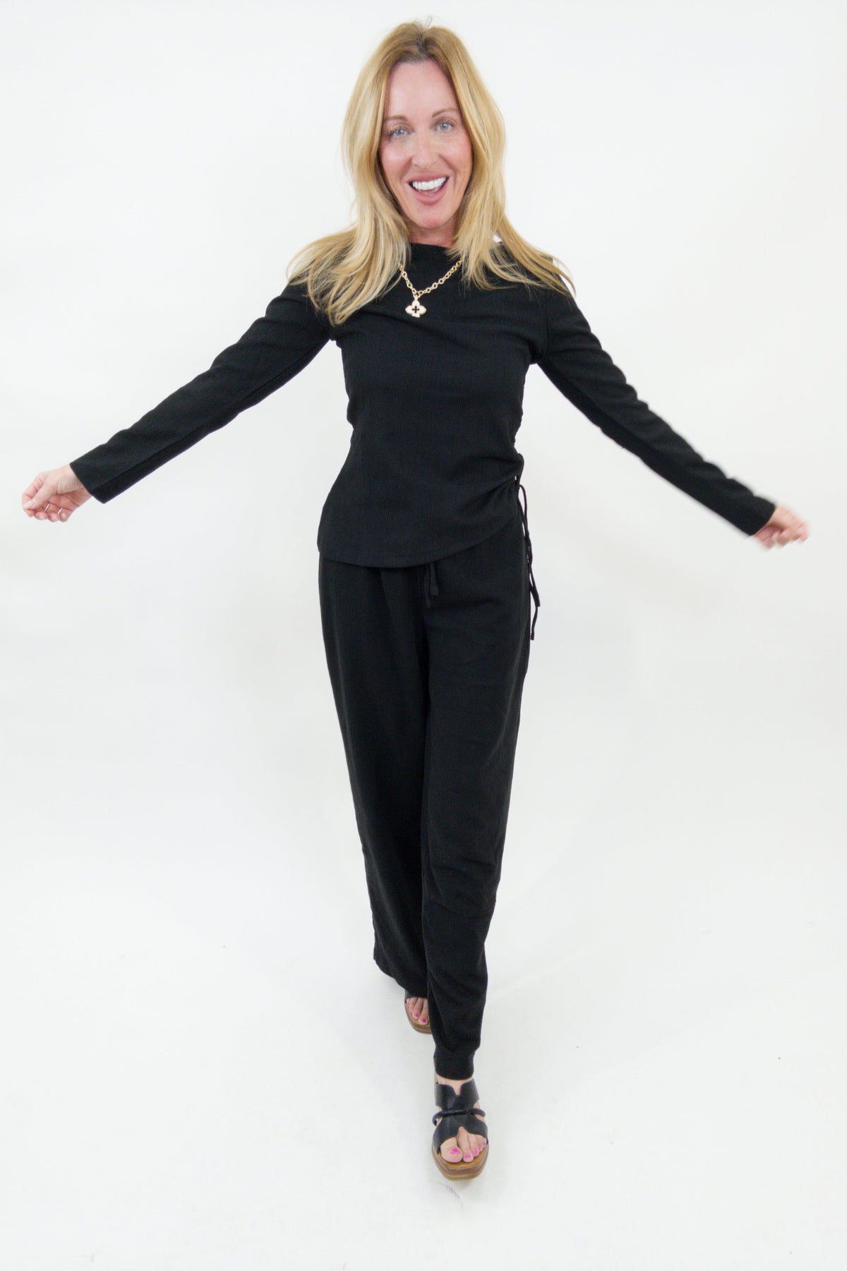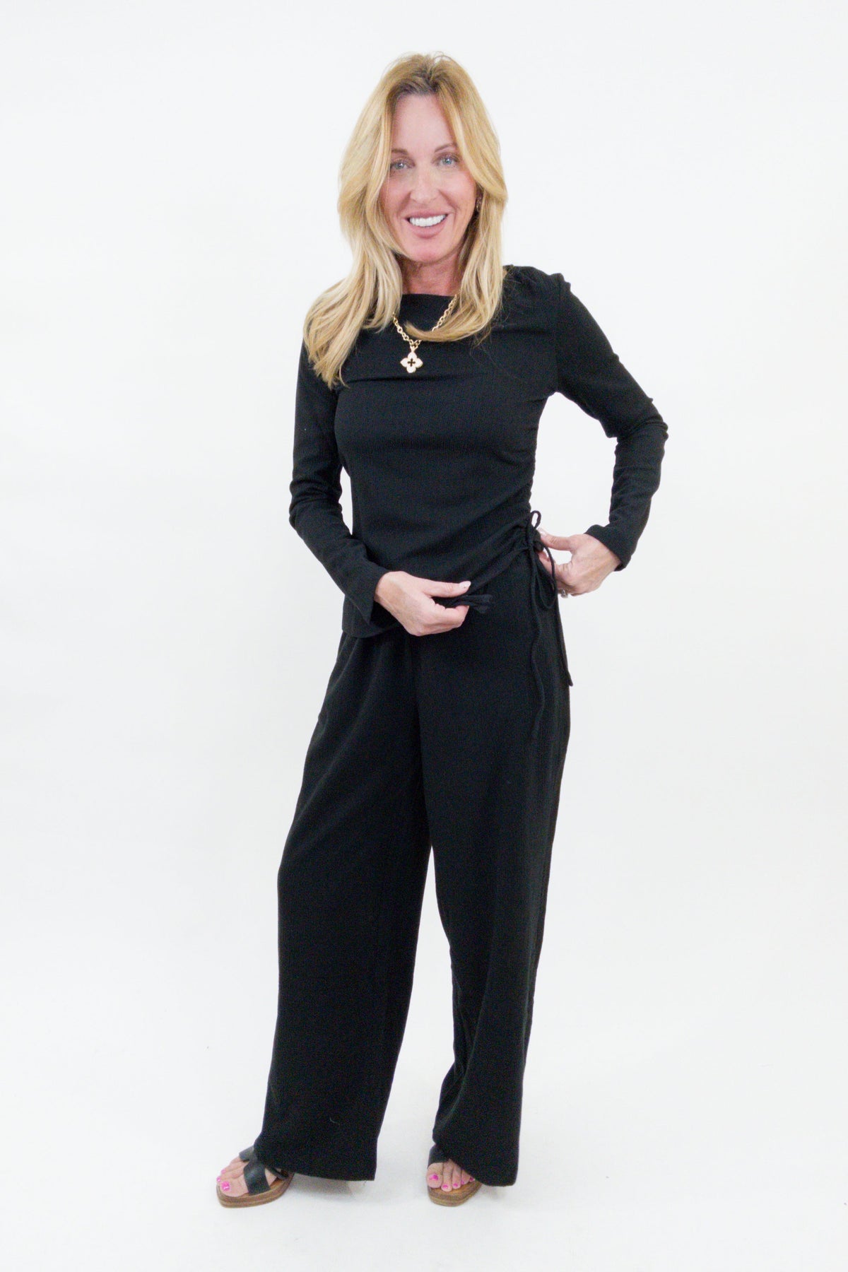 This top is all about effortless shape with a soft, elevated feel. Crafted from a textured rib knit, it features a flattering side ruching detail that gently defines the waist while keeping the fit comfy and relaxed. The classic round neckline and long sleeves make it an easy go-to for layering or wearing on its own.