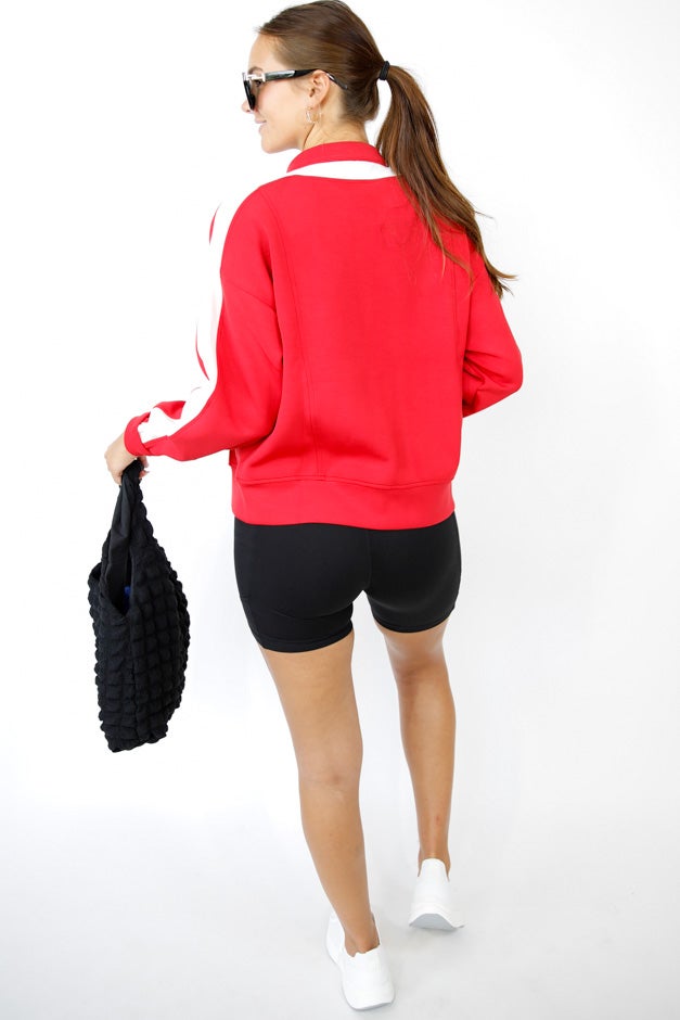 Upgrade your athleisure look with this sleek zip-up jacket featuring a modern contrast stripe detail along the sleeves. Crafted from ultra-soft modal poly span scuba fabric, this lightweight jacket offers a relaxed fit with a mock neck, full zip closure, and convenient side pockets. Perfect for layering over your activewear or styling for a casual streetwear vibe, this jacket combines comfort with a sporty-chic edge.