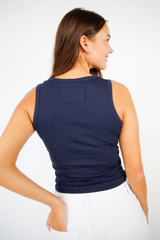 Your Americana moment just got a major upgrade. The Stars & Stripes Muscle Tank is the ultimate go-to for Fourth of July BBQs, summer festivals, and all things red, white, and blue. With a sporty high neckline and a fitted silhouette, this sleeveless knit tank flaunts bold USA lettering and an embroidered flag graphic—patriotic and cute.