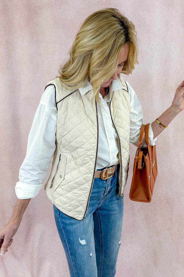 Stay warm and stylish with our Cozy Luxe Quilted Vest, designed for both comfort and sophistication. Featuring a chic suede piping detail and ribbed side panels, this vest delivers a tailored fit that flatters all silhouettes. The quilted padding adds a touch of elegance while ensuring you stay snug during colder days. With front pockets for added functionality and a sleek zip-up design, it’s the perfect layering piece for casual outings or brisk morning walks.