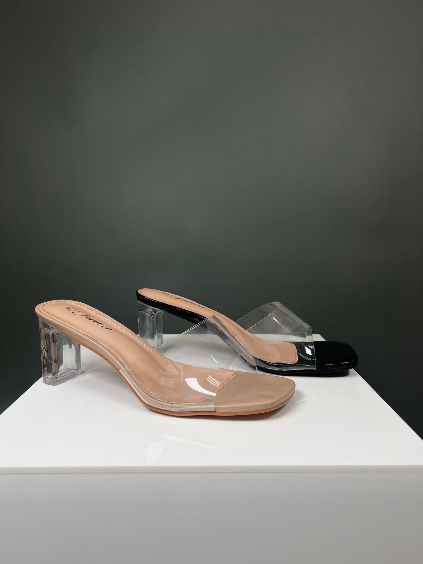 • Sculpted lucite heel