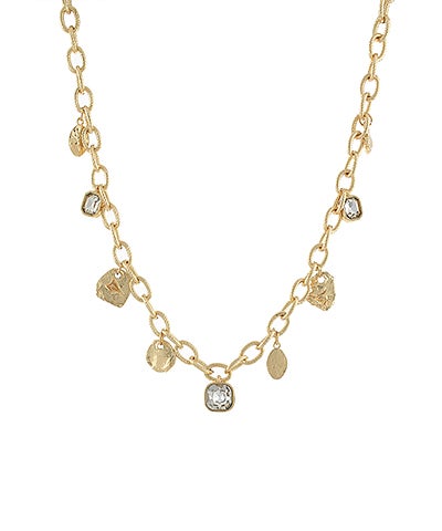 Add a dash of shimmer and a sprinkle of play to your neckline with the Golden Glimmer Charm Necklace. Featuring a chunky chain adorned with textured gold-tone charms and sparkling crystal drops, this piece is all about effortless layering and eye-catching shine. Available in classic all gold or a modern silver-gold mix—both equally stunning for dressing up tees, knits, or plunging necklines.