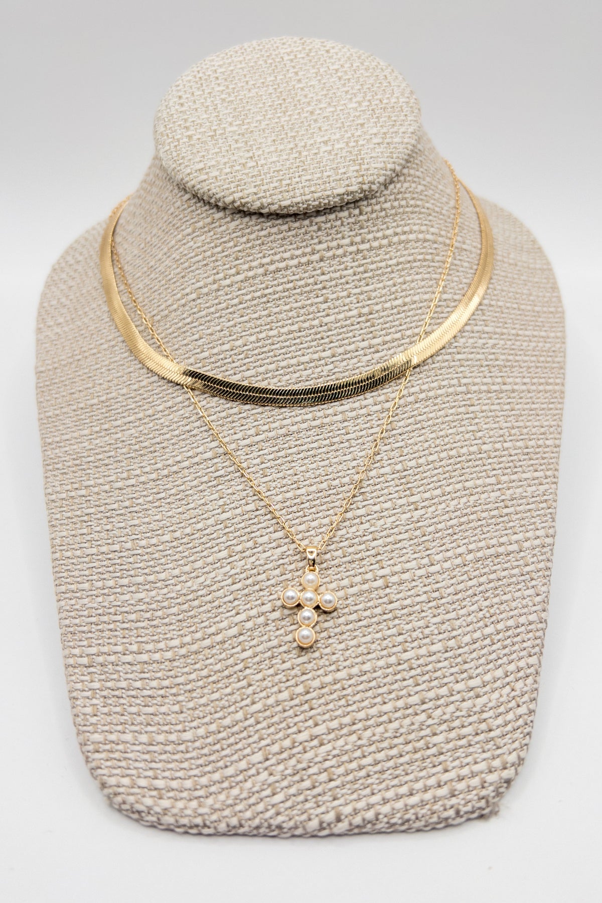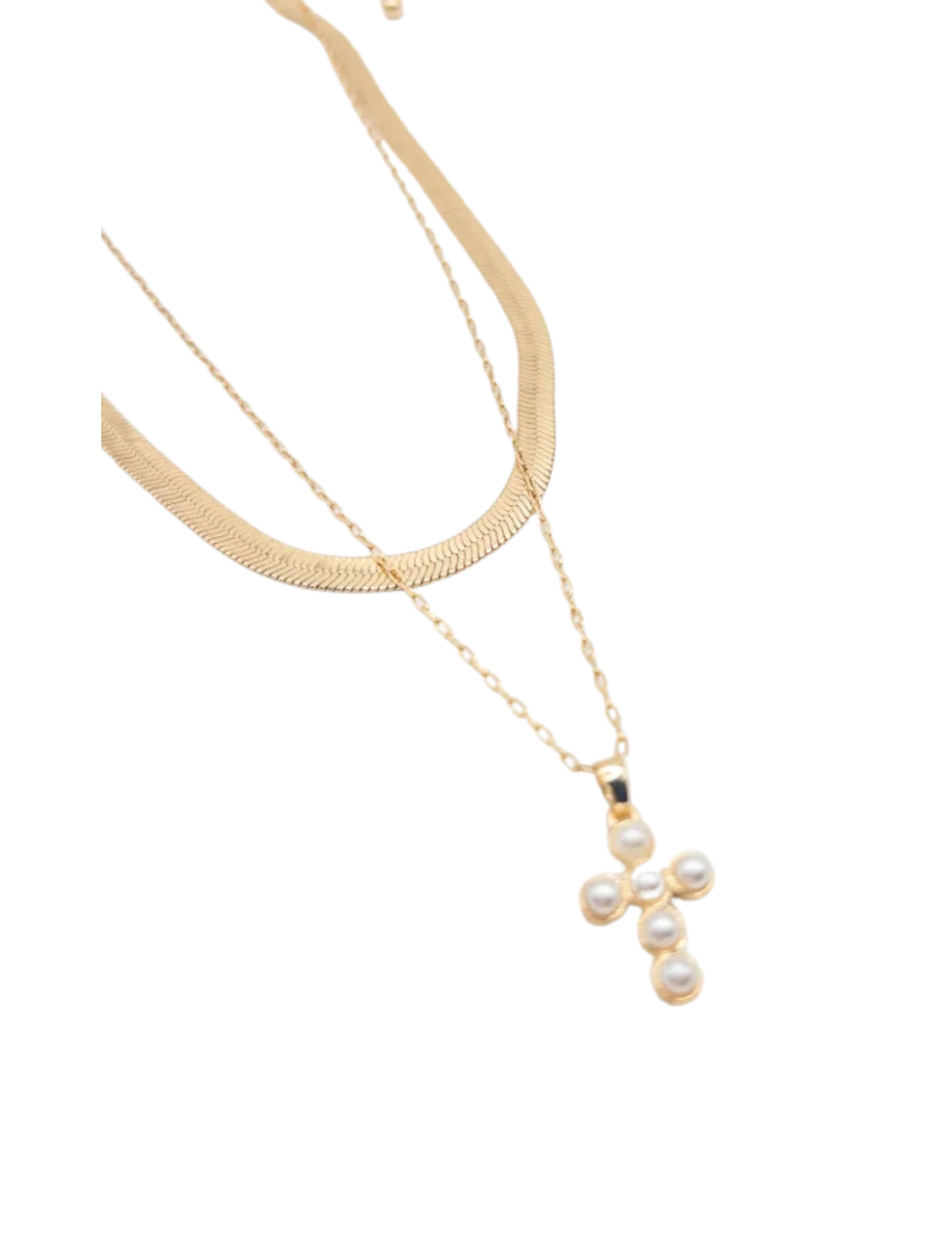 Pearl Cross and Snake Chain Layered Necklace