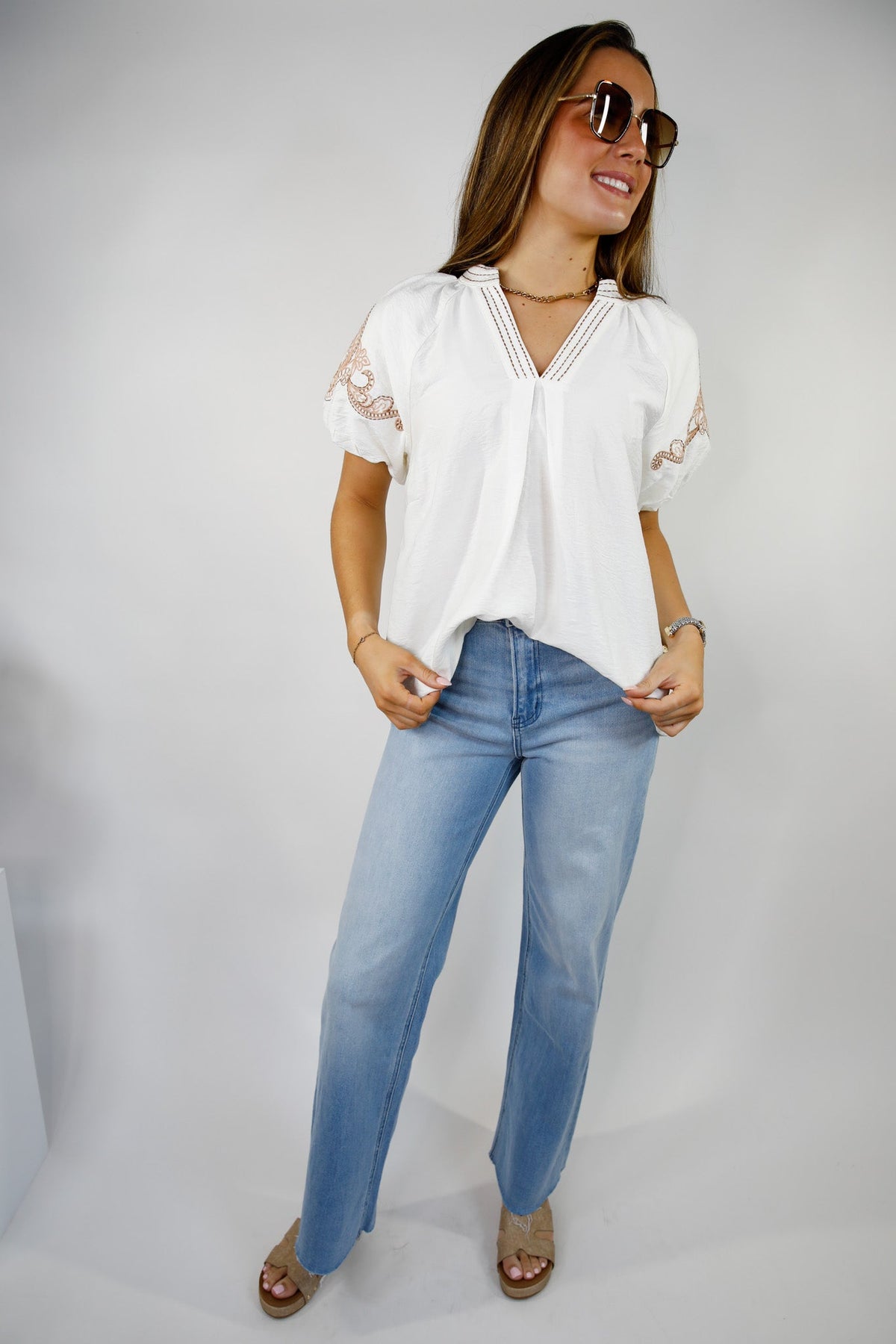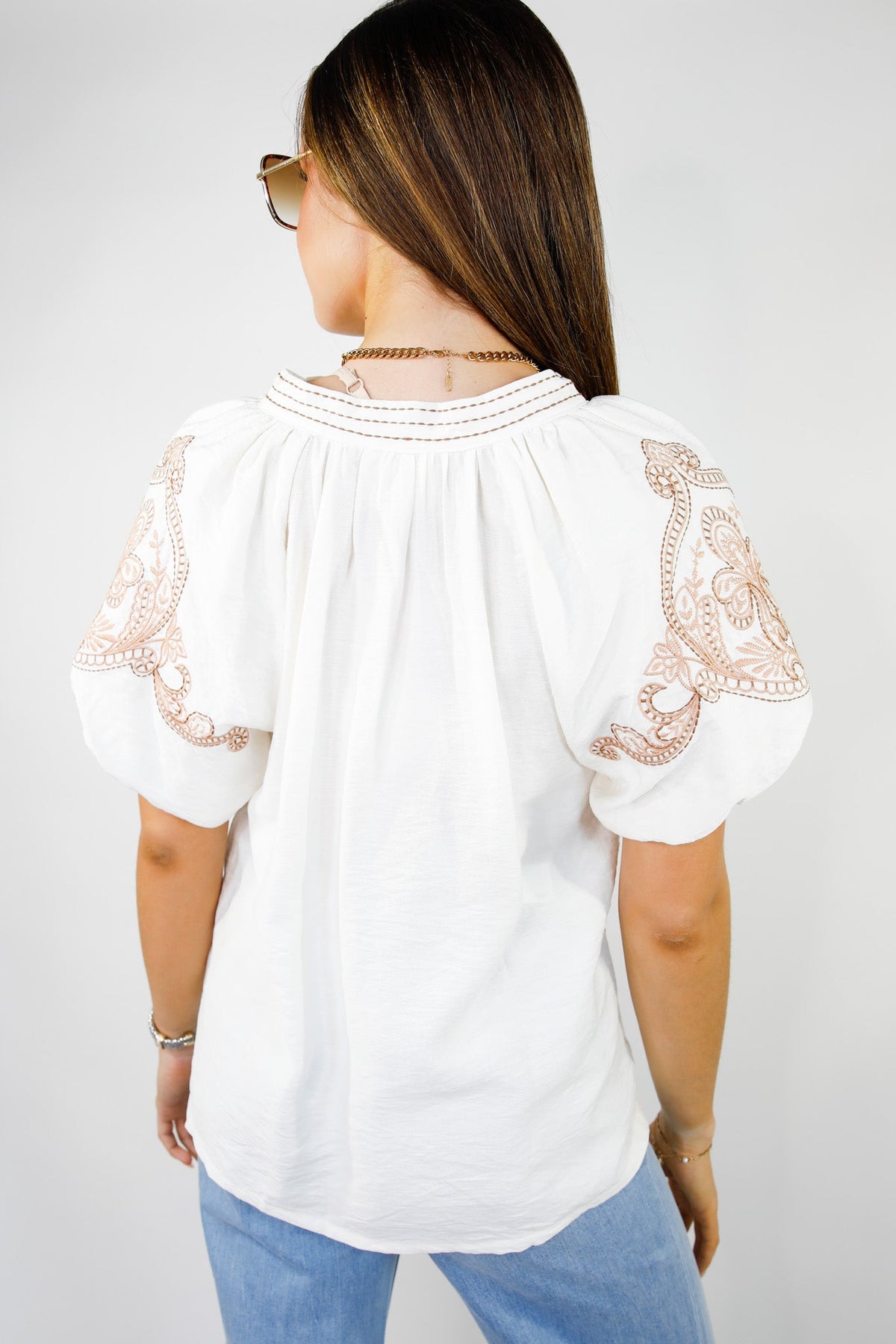 The Sahara Sands Embroidered Blouse brings effortless boho elegance to your everyday style. Crafted from soft, textured fabric, it features intricate tan embroidery along the puff sleeves and a delicately stitched neckline that adds the perfect artisanal touch. The relaxed silhouette makes it easy to style for any occasion — from brunch to boutique strolls.