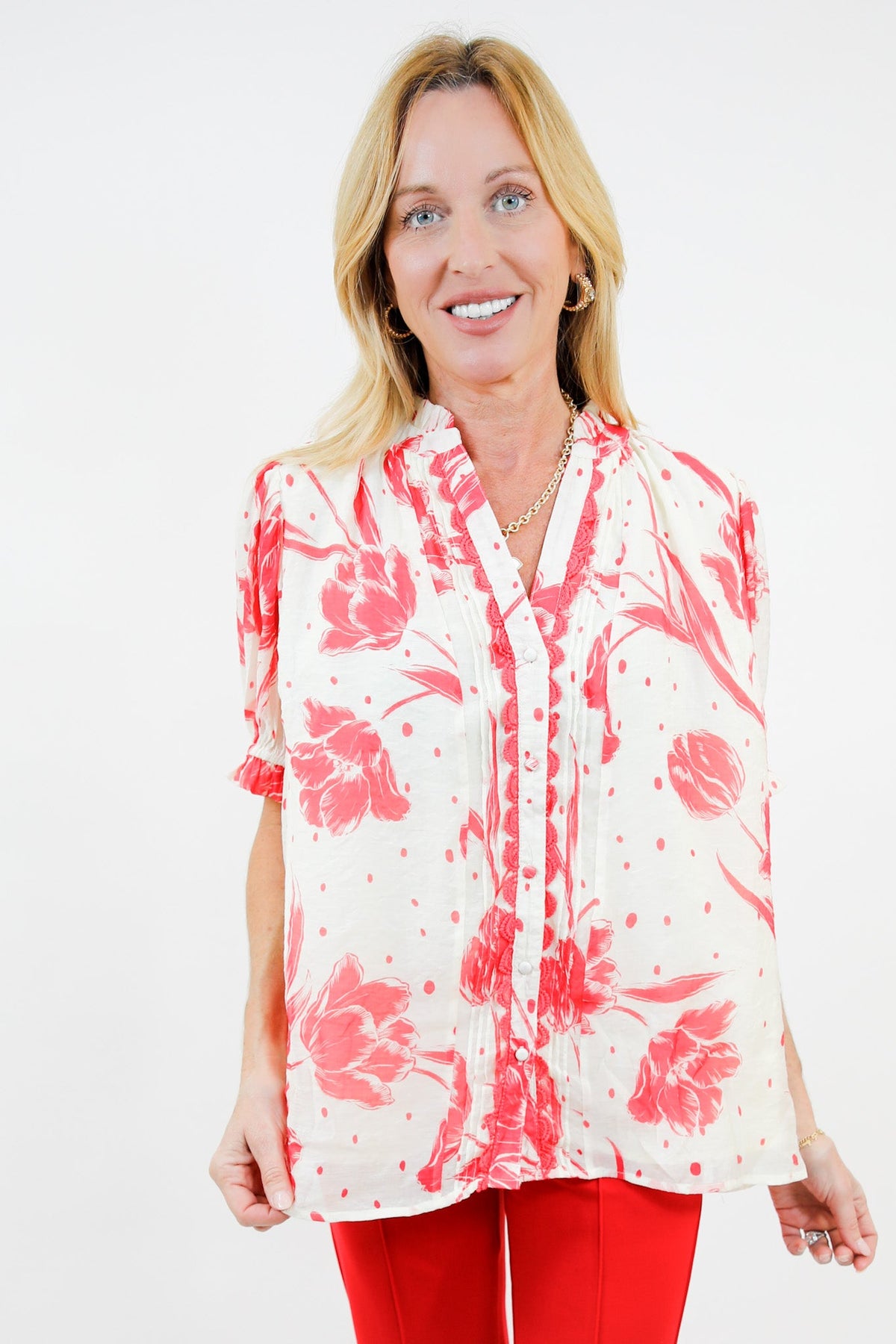 Soft, feminine, and full of boutique charm, the Rosewood Meadow Blouse is one of those easy pieces that instantly elevates your everyday denim. The cream base with bold red floral print gives it that fresh, artsy feel, while the delicate lace trim and pin-tuck details add just the right amount of vintage romance.
