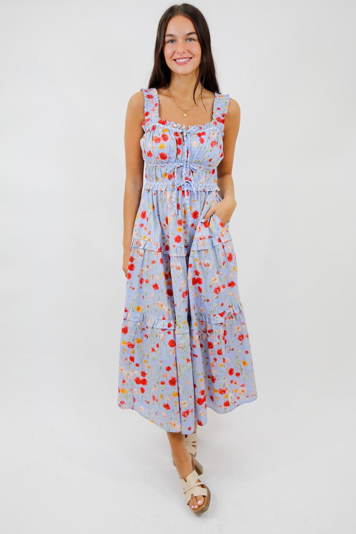 This dreamy midi is all about effortless romance. Featuring a soft blue base with delicate floral detailing, the Bluebell Meadow Tiered Midi Dress brings movement and charm with every step. The ruffled neckline and adjustable waist ties create a flattering, feminine shape while keeping the fit easy and comfortable.