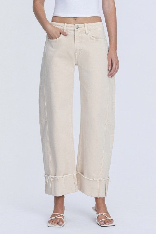 The Coastal Cream Barrel Jeans bring a fresh, elevated take to your denim rotation. Designed in a soft neutral tone, these high-rise jeans feature a relaxed barrel-leg silhouette with a statement cuffed raw hem for that effortless modern edge. Side panel detailing adds subtle dimension, while the comfort-stretch denim ensures an easy, flattering fit. Perfect for pairing with tanks, knits, or button-downs for a chic, coastal-inspired look.