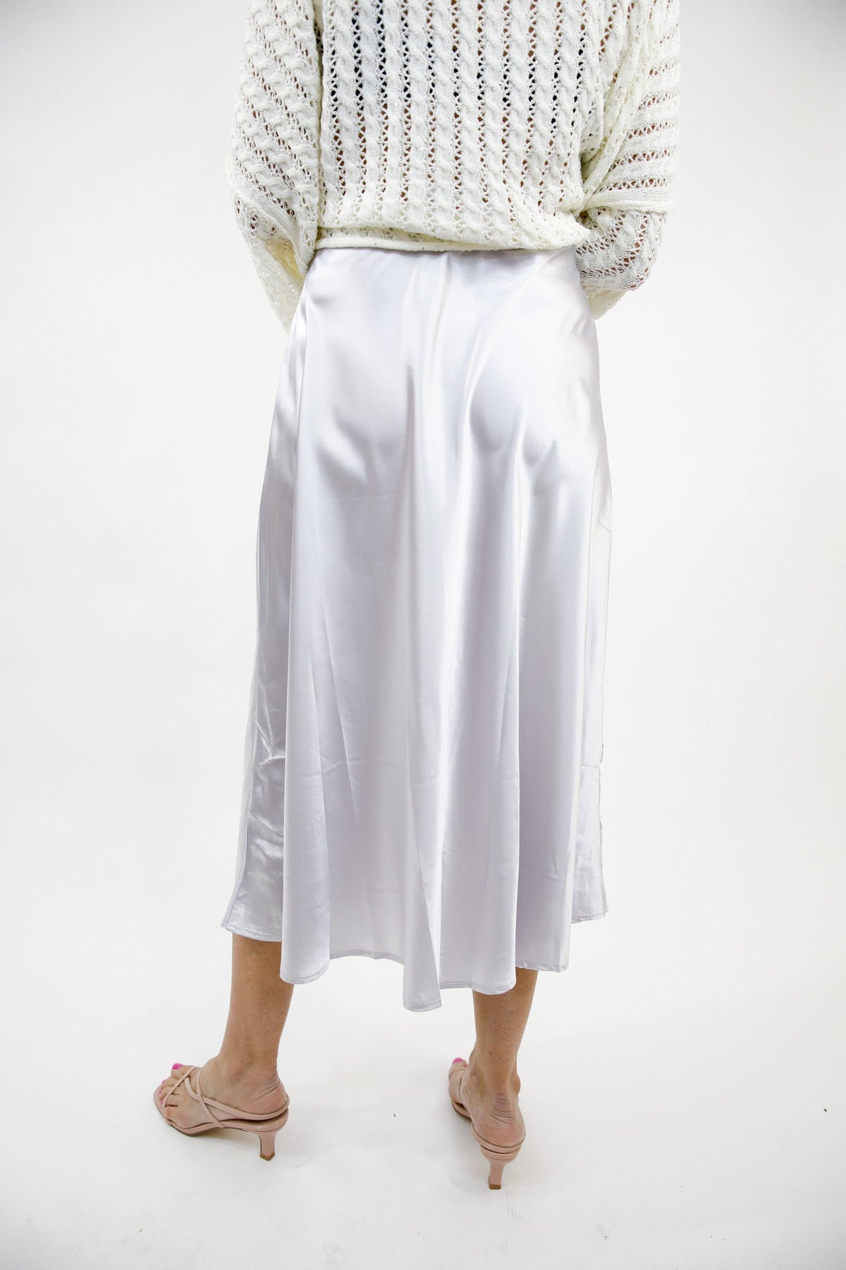 This satin midi skirt brings effortless elegance with a soft, fluid drape that moves beautifully with every step. Designed with a comfortable elastic high waist and a silky sheen, it creates that timeless, dressed-up look while still feeling easy and wearable. It’s the kind of piece that instantly elevates even the simplest top.