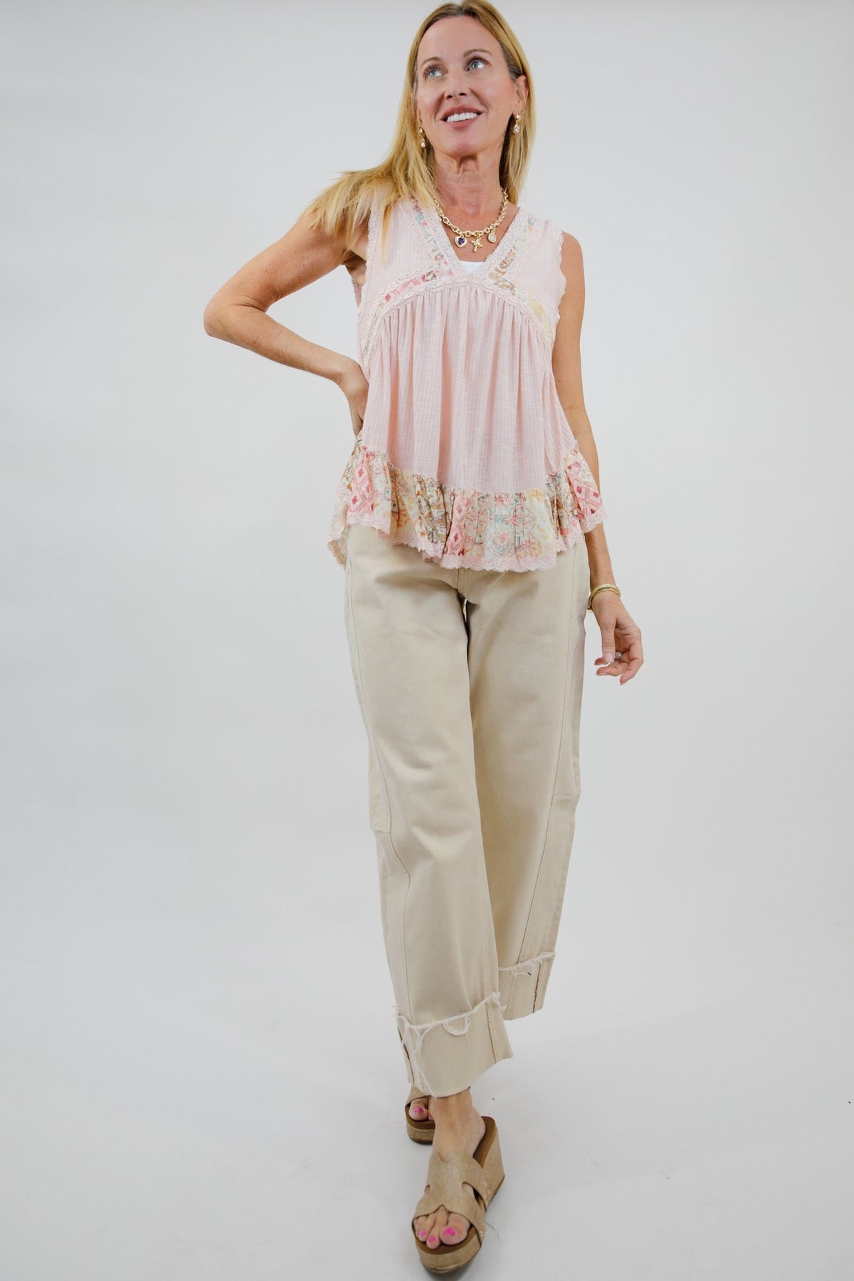 Soft, vintage-inspired, and effortlessly romantic, the Willowmere Lace Babydoll Tank is one of those pieces that feels collected over time. Designed with delicate lace trim, a flowy gathered bodice, and a ruffled hem finished with mixed print accents, this sleeveless tank brings signature POL charm with an easy, wearable silhouette.