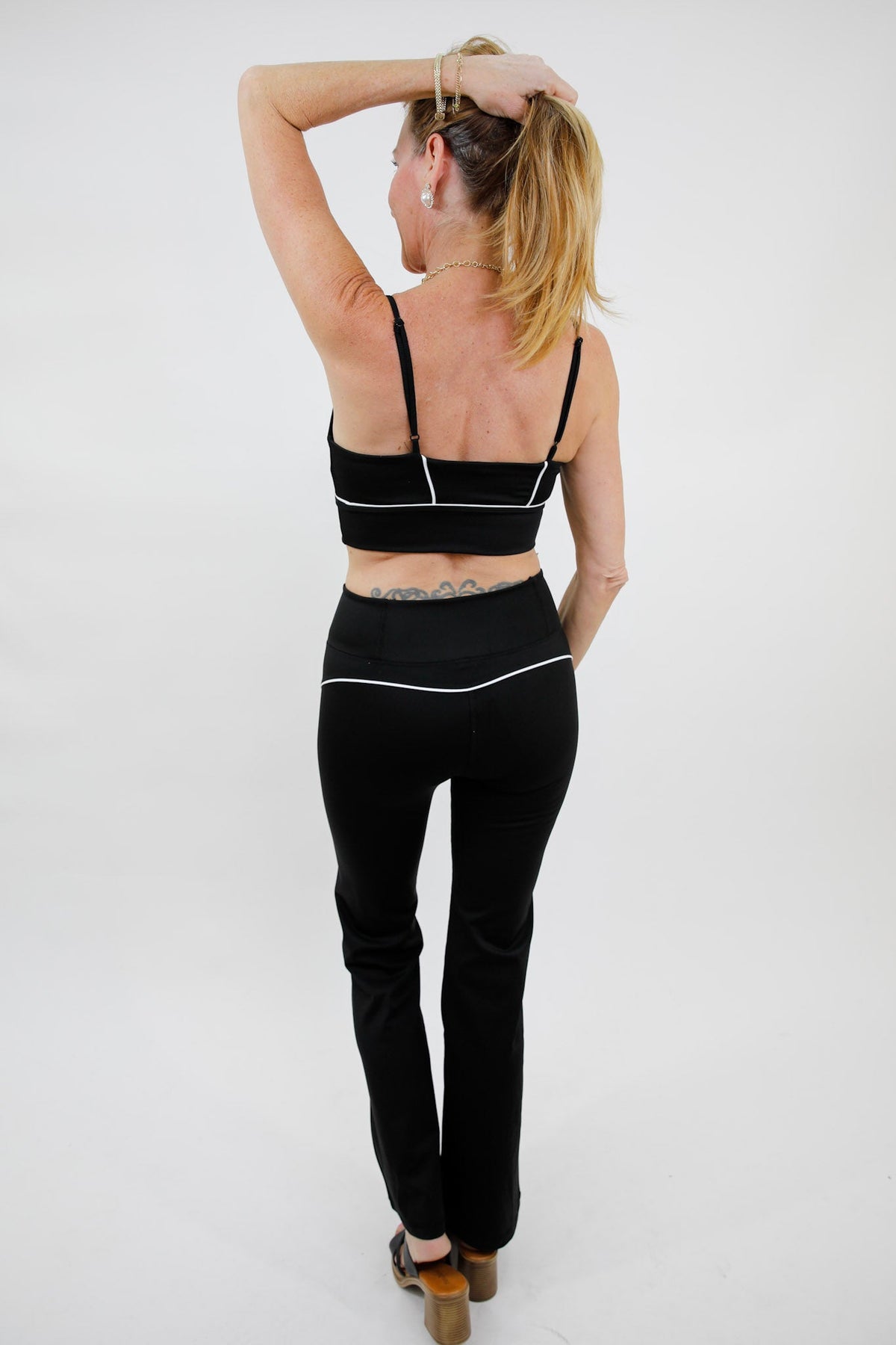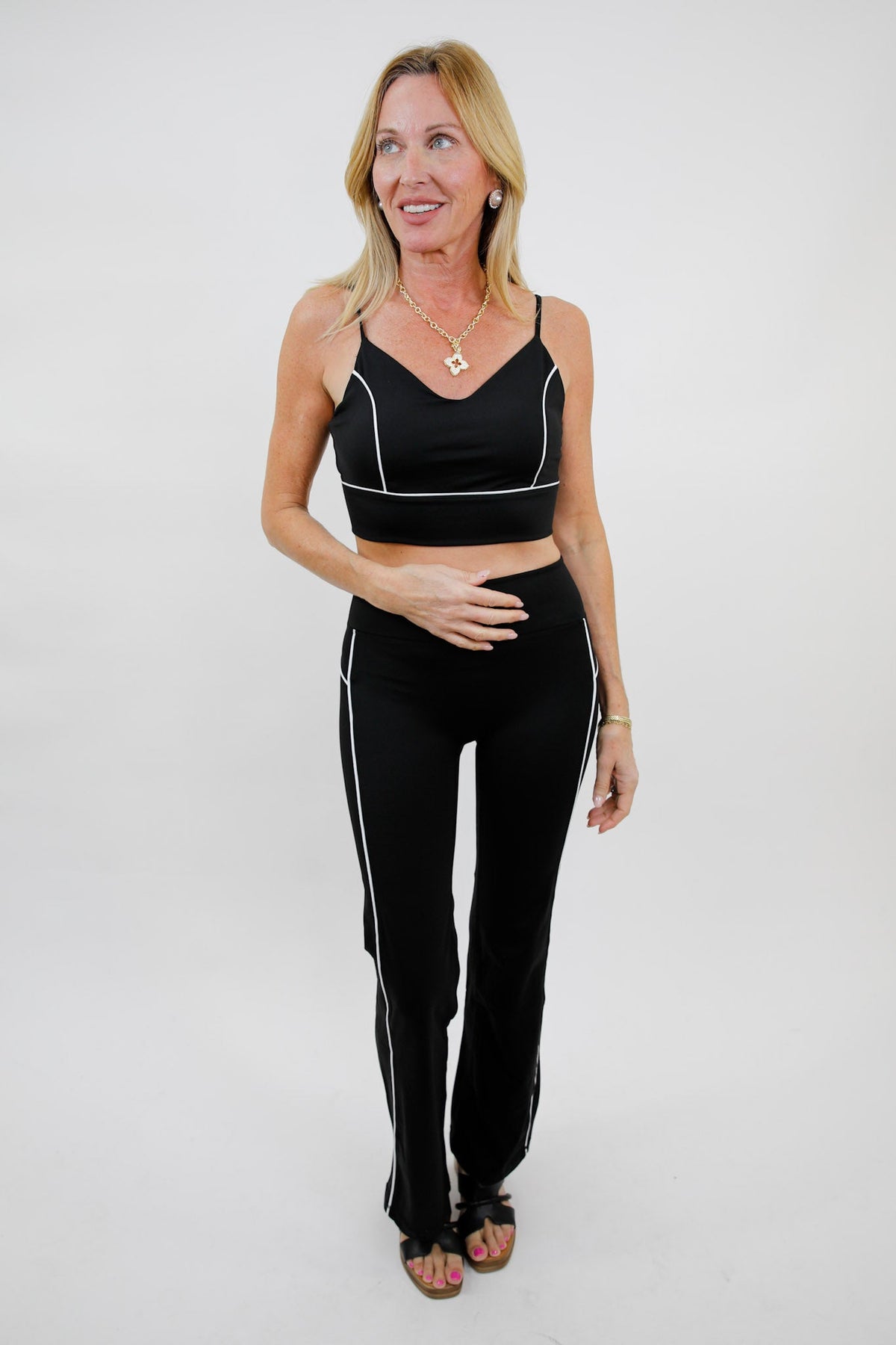 This sleek cami-style bra top is where performance meets everyday polish. Designed with a flattering V-neckline and contrast piping that defines the shape just right, it gives you that sculpted, confident look without trying too hard. The smooth, stretchy fabric hugs comfortably while still allowing easy movement.