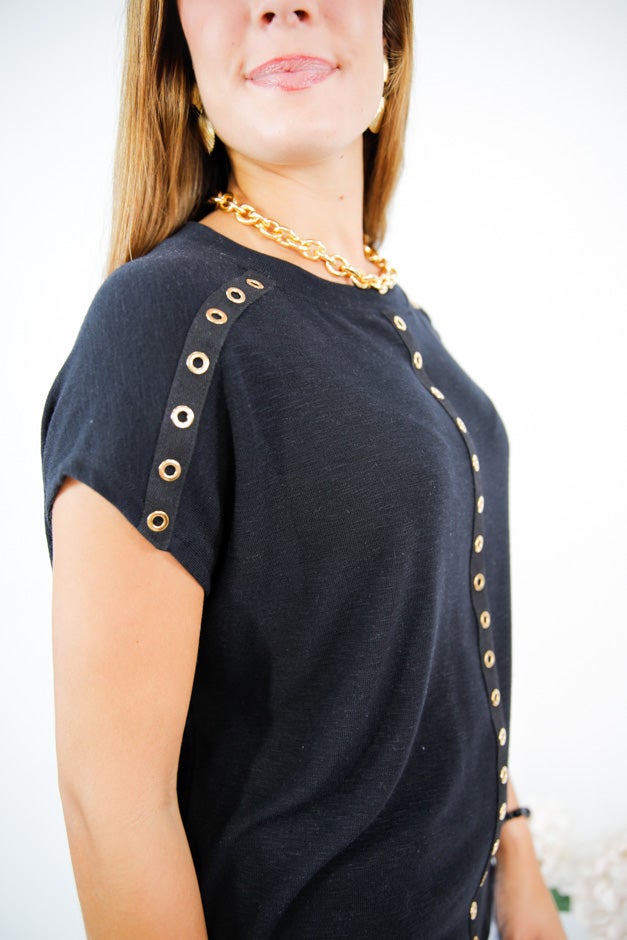 The Golden Coast Grommet Tee is where effortless cool meets elevated detail. Crafted in a jet-black knit with a soft drape and easy fit, this tee is all about the statement—featuring bold gold eyelets tracing the shoulders and front for a touch of glam. It’s laid-back luxe, perfect for golden hour cocktails or a weekend escape.